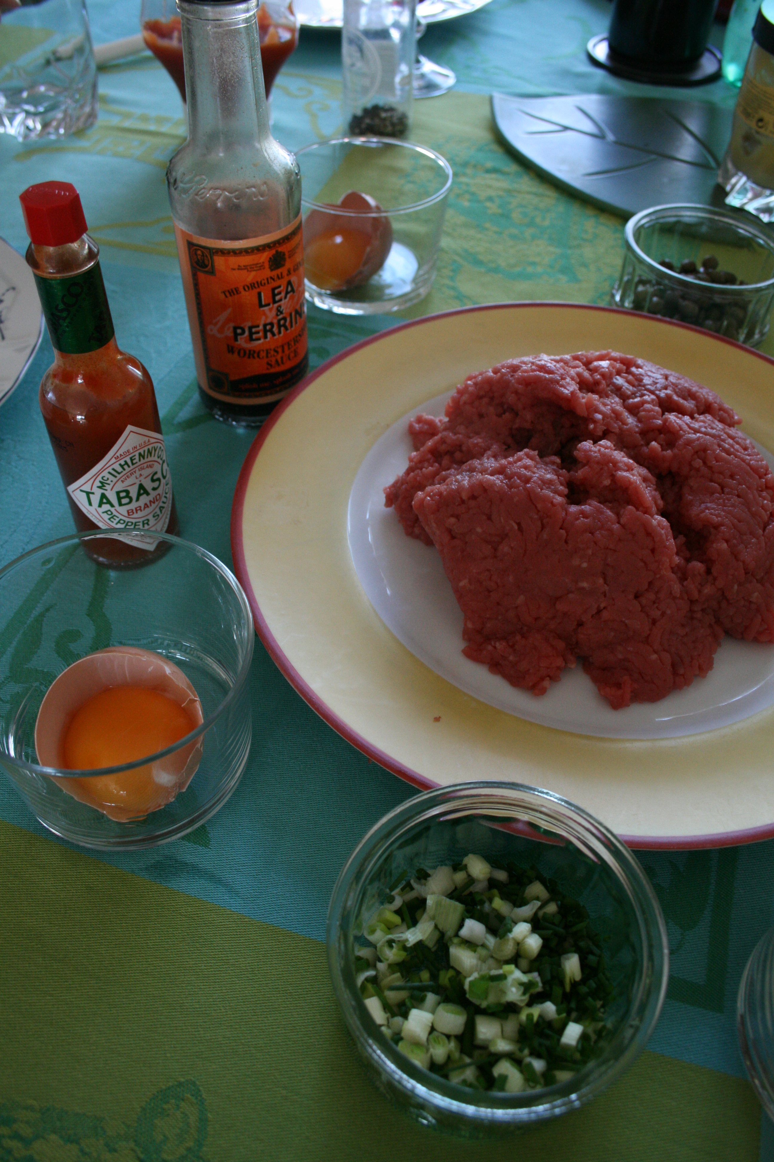 Ingrédients: par personne, 200 gr de viande hachée (impérativement fraîche ;-)), 1 oignon nouveau, 1 jaune d’œuf, du persil ciselé, de la moutarde, huile, sauce Worcestershire, Tabasco, câpres, ketchup, sel, poivre.