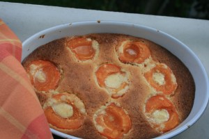 Ingrédients: 90gr d’amandes en poudre, 90 gr de beurre doux ramolli, 100 gr de sucre, 2 oeufs, 500 gr d’abricots .