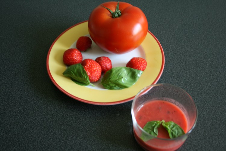 Ingrédients: pour 4 pers., 600gr de tomates, 500 gr de fraises, 8 feuilles de basilic, huile d’olive, poivre, sel de guérande, le jus d’un 1/2 citron.