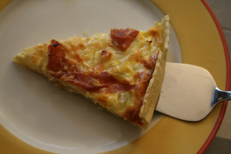 Ingrédients: pour 5 pers, pâte brisée, 3 gros oignons, 4 oeufs, 30 cl de lait, 2 cuillères de crème fraîche, 2 tranches de jambon cru, sel, poivre, 1 morceau de beurre, du gruyère rapé.