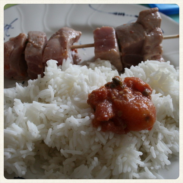 Préchauffer le gril du four, égoutter les morceaux de thon et les piquer sur des brochettes en intercalant 2 gousses d’ail, réserver la marinade. Mettre sur la grille du four (ou sur un barbecue) et laisser cuire 10 minutes en retournant à mi-cuisson. Émincer l’oignon, dans une casserole, faire chauffer un peu d’huile d’olive et faire revenir l’oignon. Verser la marinade et laisser chauffer 5 minutes à feu doux, rajouter les câpres en fin de cuisson. Servir avec du riz ou de la semoule.