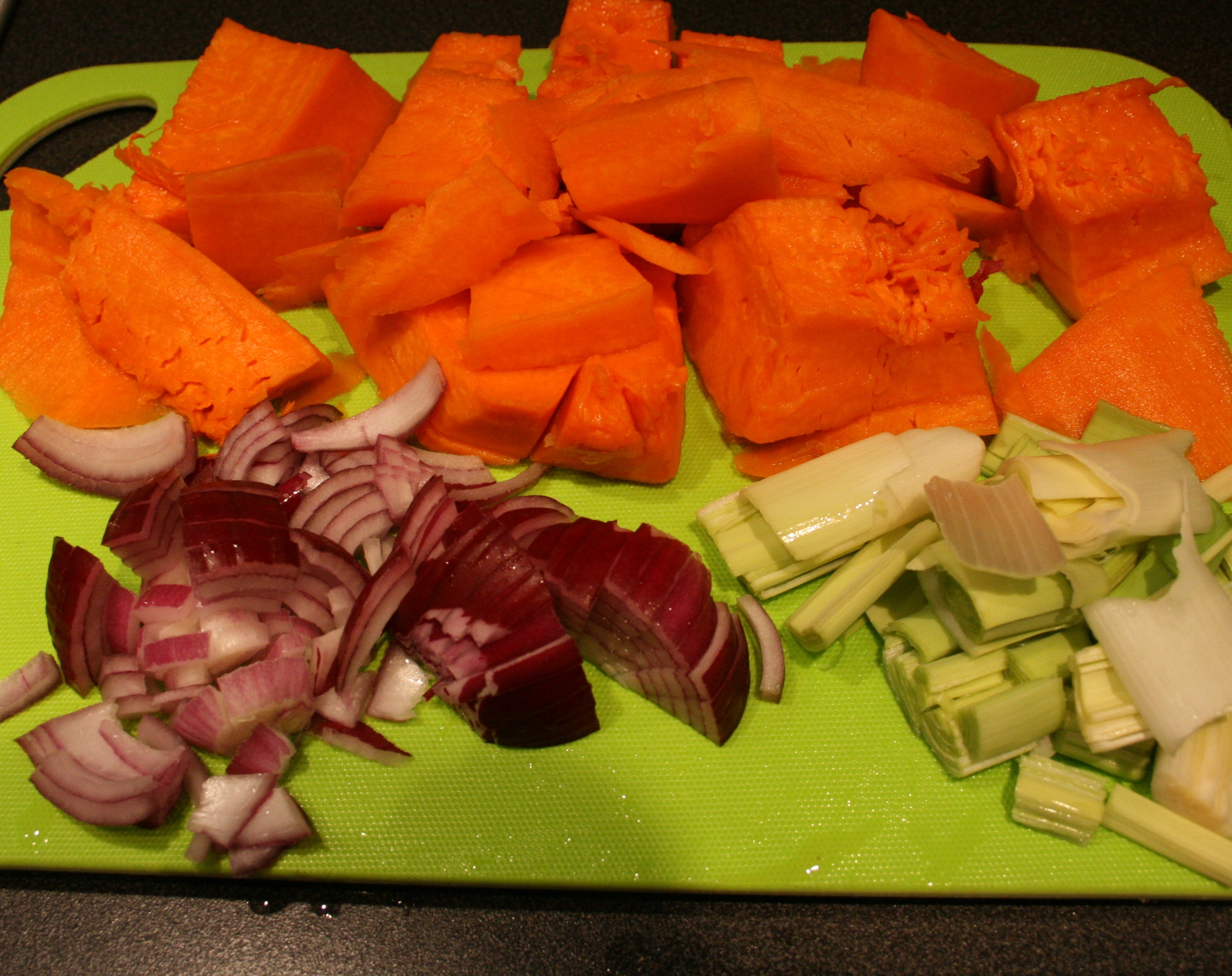 Couper en petits morceaux: l’oignon, le blanc de poireau et le potiron.