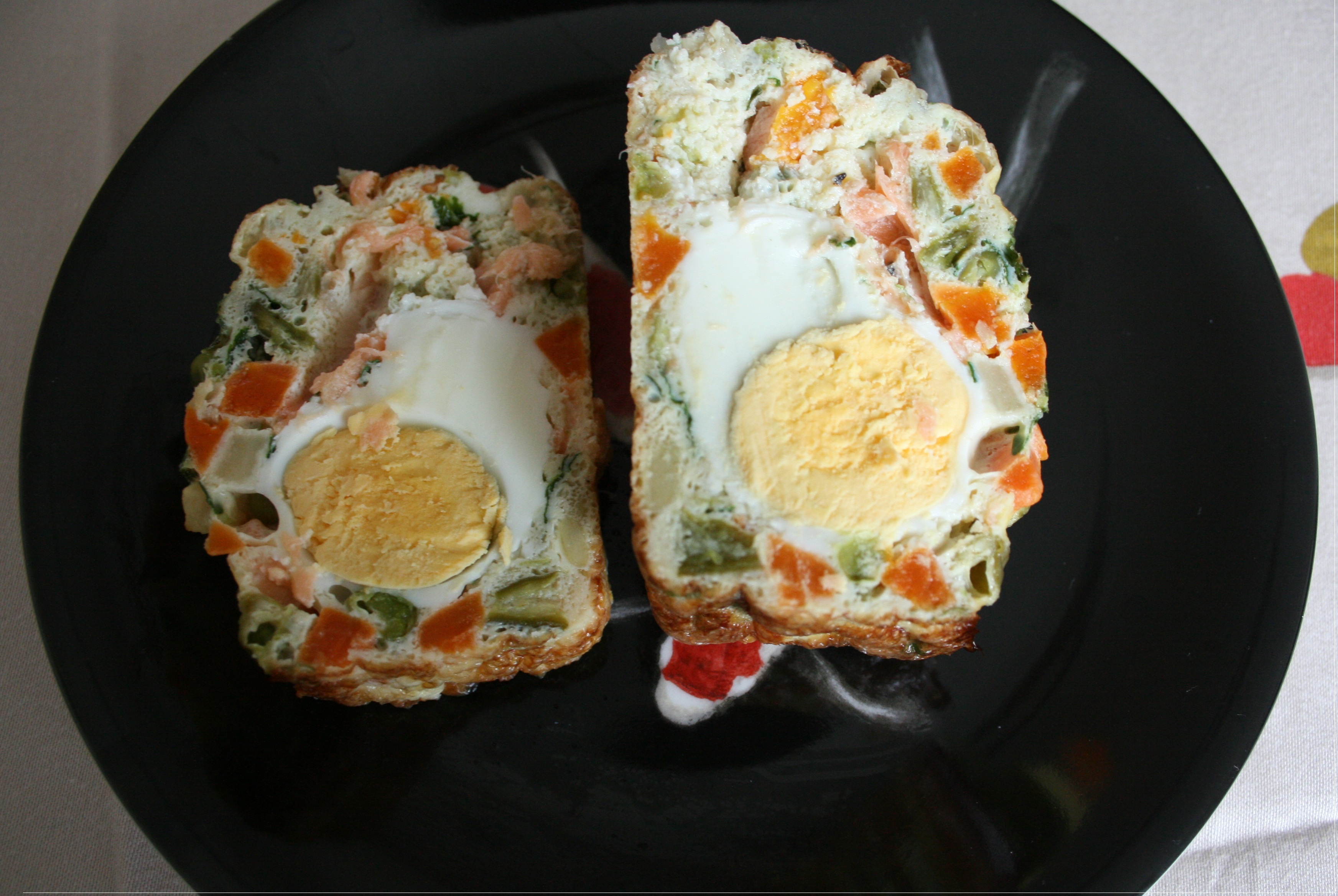 Ingrédients: pour 4-5 pers., 200 gr de macédoine de légumes surgelés, 6 oeufs, mélange d’herbes ciselées (persil, aneth, estragon), une noix de beurre, sel, poivre, une demie tranche de saumon fumé.
