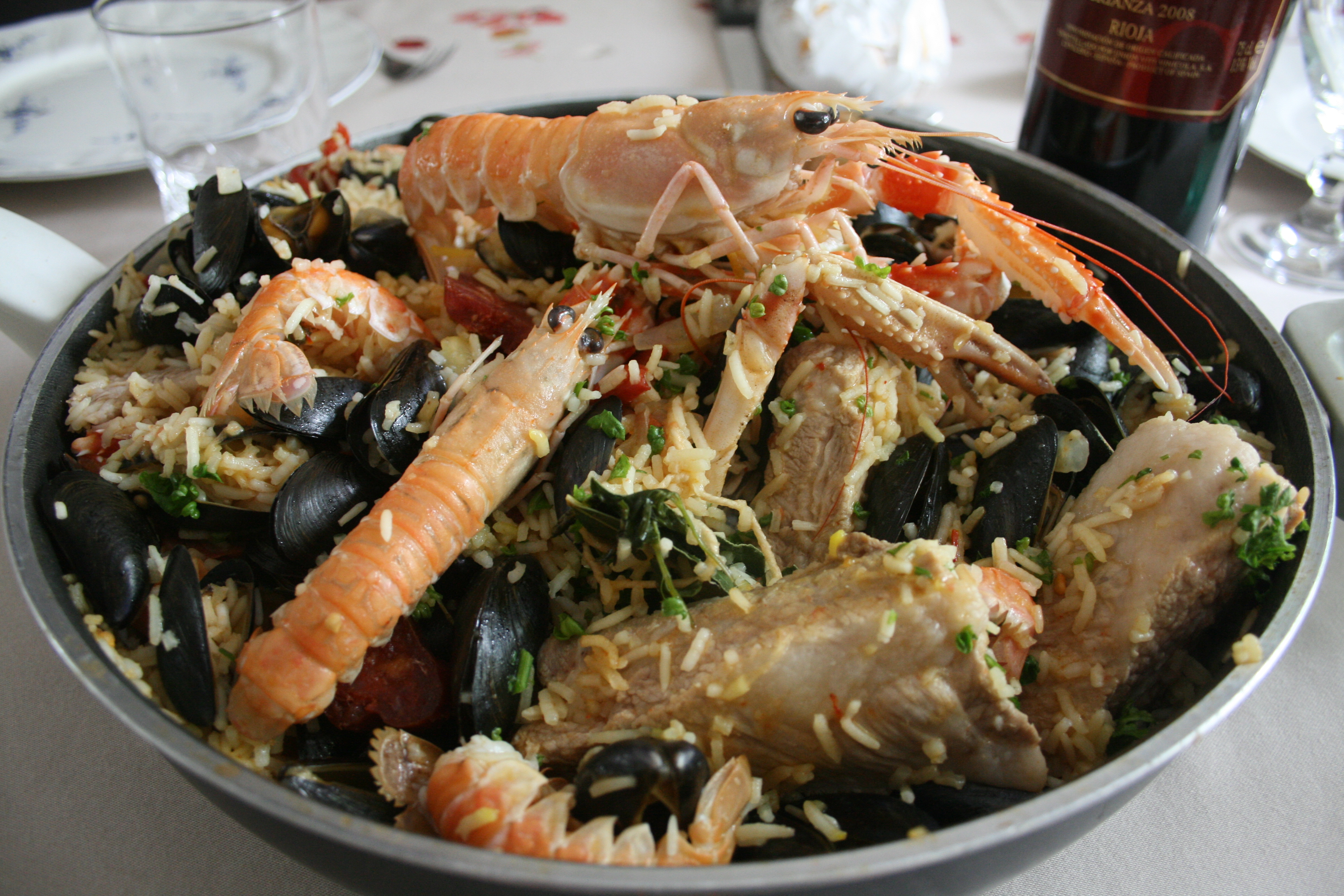 Ingrédients: pour 6 pers., 1 kg de côtes de porc (ou de poulet) coupées en morceaux, 3 oignons, 6 langoustines (ou grosses crevettes), 1/2 litre de moules, 3 tomates, 400 gr de riz, 2 gousses d’ail, 1 bouquet garni (thym, persil, laurier), 1 pincée de filaments de safran, 1 morceau de chorizo, huile d’olive, sel, poivre, 1 citron.