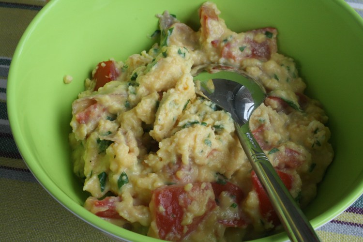 Couper et épépiner les tomates. Dans un saladier, battre en omelette les 5 œufs, ajouter les morceaux de tomates, le gruyère rapé, le sel, le poivre et les herbes ciselées. Verser un fond d’eau dans une grande casserole, faire chauffer les oeufs battus au bain marie, à feu moyen sans cesser de remuer.