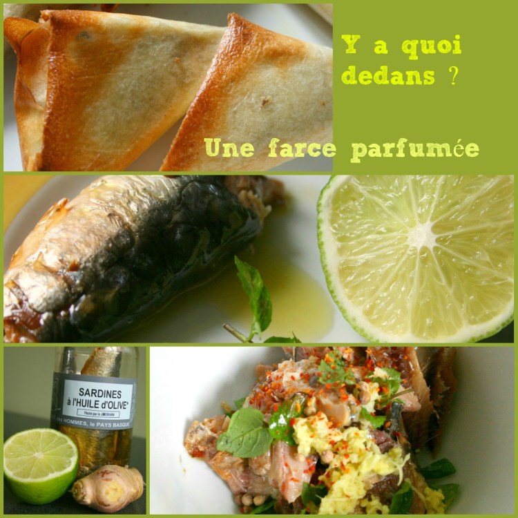 Ingrédients: une boite de sardines à l’huile, 6 feuilles de bricks, huile d’olive, quelques brins de menthe (ou de coriandre, persil,..), une pincée de piment d’espelette (ou du poivre), un morceau de gingembre (facultatif), 1 citron vert (facultatif), une échalote.