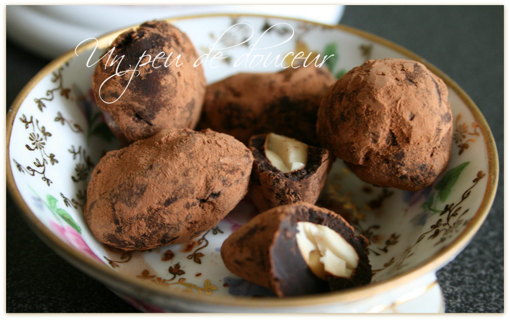 Ingrédients: pour une vingtaine de truffes, 125 gr de chocolat noir (70%), 50 gr de beurre, 1 jaune d’oeuf, 60 gr de sucre glace, cacao en poudre (non sucré), une vingtaine d’amandes.