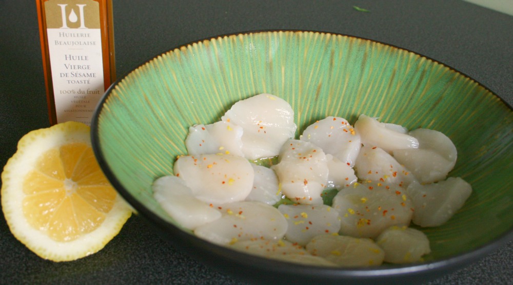 Ingrédients: pour 4 personnes, 12 noix de Saint Jacques, le zeste d’un citron vert ou jaune, 1 filet d’huile de sésame, 1 pincée de piment d’espelette, fleur de sel.