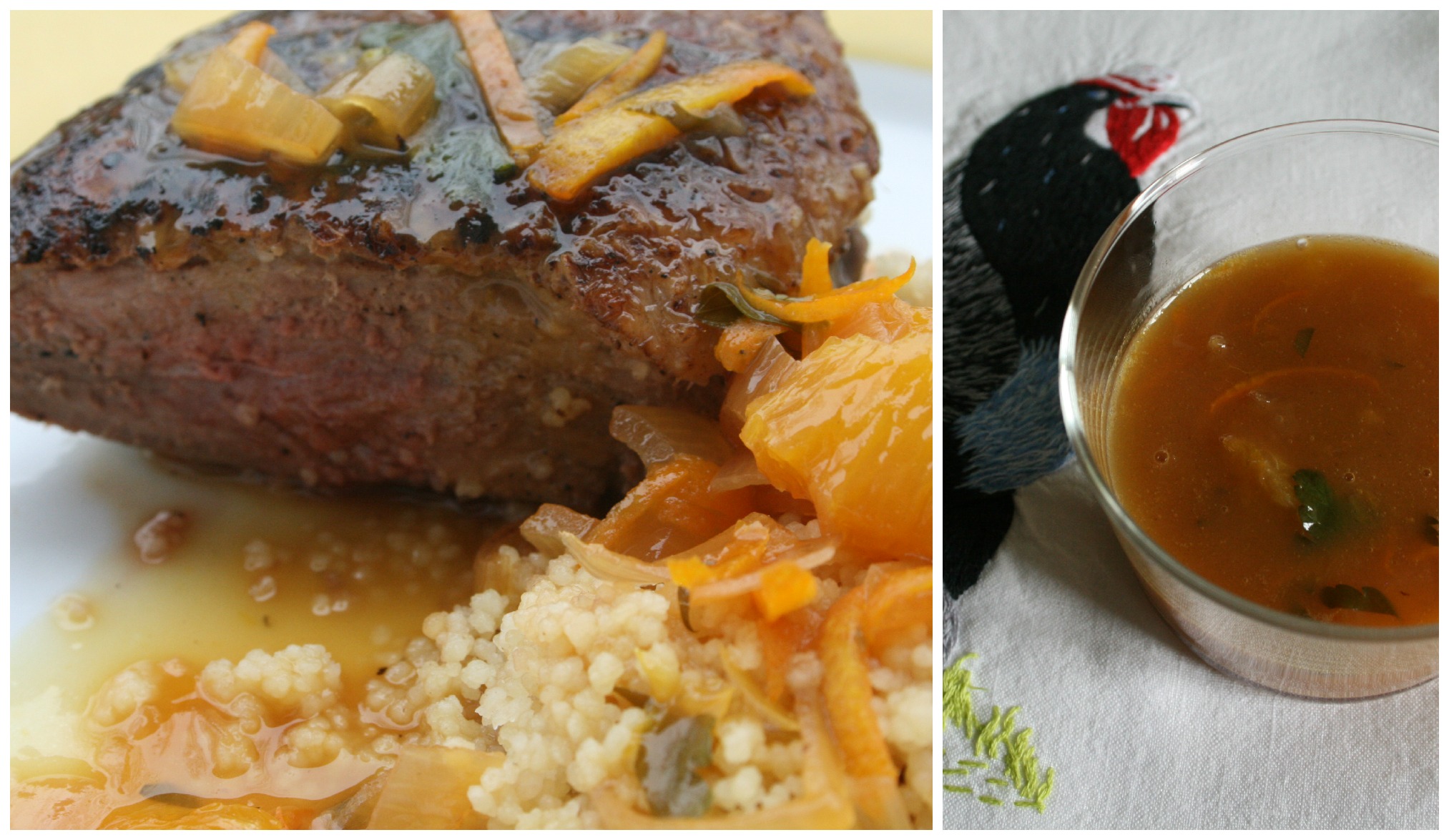 Ingrédients: pour 4 pers., 2 magrets de canard, 2 oranges (non traitées), le zeste d’un citron (non traité), 2 cuillères à soupe de vinaigre balsamique blanc (ou un vinaigre de vin blanc), 1 échalote, 3 morceaux de sucre, 20 gr de beurre, 10 gr de farine, sel et poivre, quelques brins de persil (facultatif).