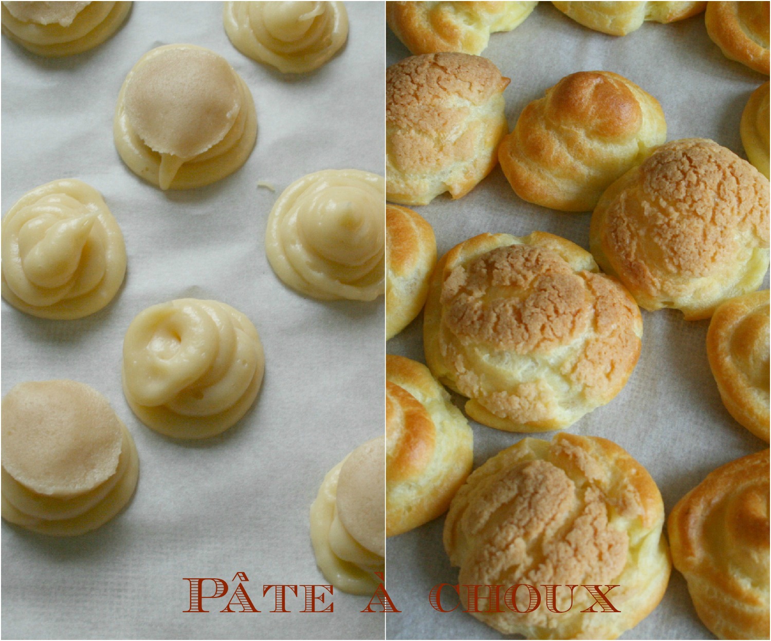 Coucher les choux: préchauffer le four à 170°. Sur une plaque à pâtisserie recouverte de papier sulfurisé, déposer avec une poche à douille des petits tas de pâte, pas trop serrés, les choux vont gonfler à la cuisson. Une vidéo pour avoir le bon geste, c’est ici.