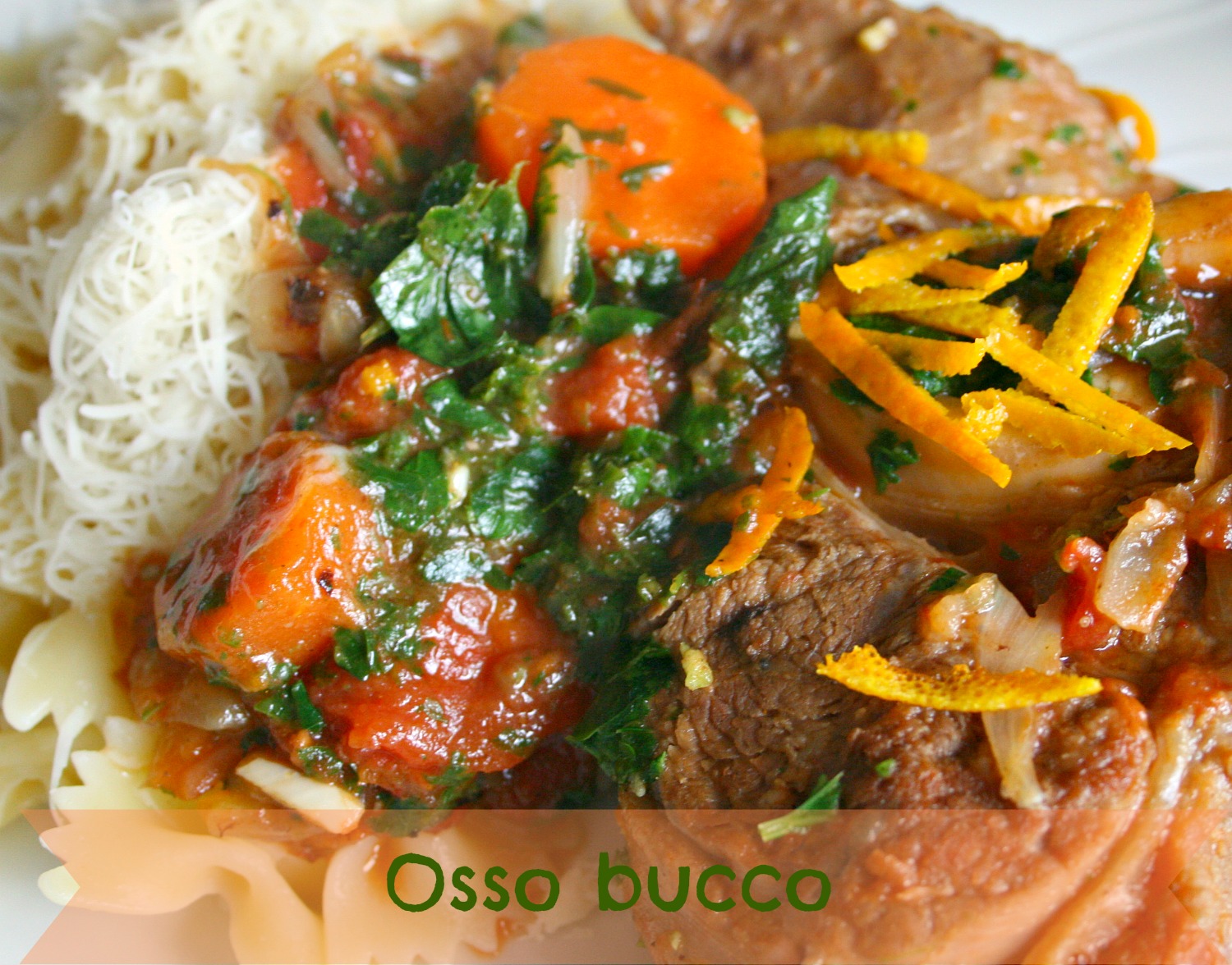 L’osso bucco, fait parti des plats qui ensoleillent un jour de grisaille. Vert, orange, rouge, c’est plein de couleurs. Le veau, les herbes, l’ail et le zeste d’orange en mettent plein les papilles.