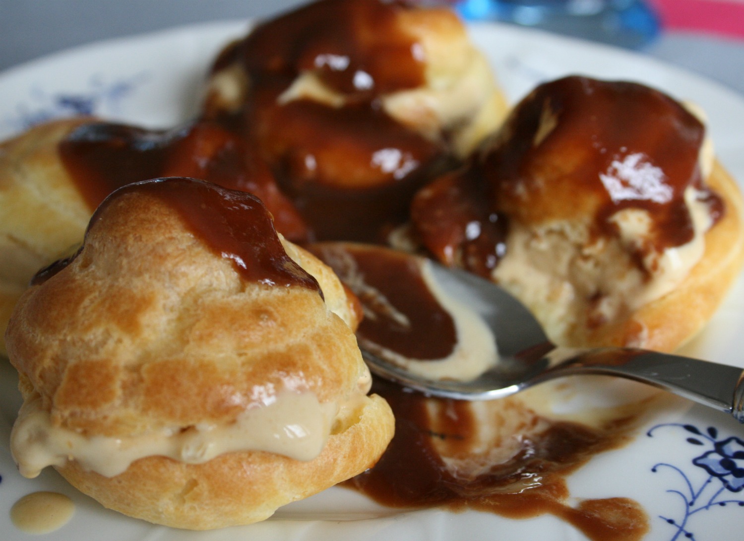 Profiteroles sauce pralinée et glace caramel au beurre salé