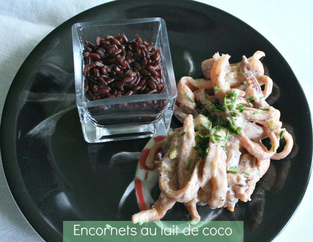 Ingrédients: pour 4 pers, 5 encornets, 4 oignons nouveaux, 1 morceau de gingembre, 2 cuillères à soupe de crème fraîche, 1 gousse d’ail, sel, poivre, coriandre en grains (ou fraîche), 20 cl de lait de coco, 200 gr de riz noir vénéré.