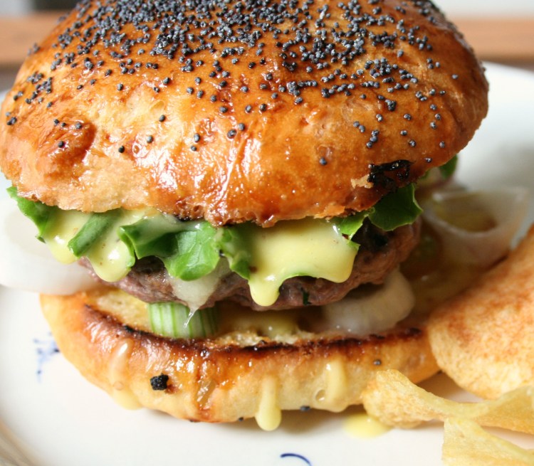 Ingrédients: pour 9 buns, 500 g de farine blanche,  1 sachet de levure boulangère sèche,  200 ml d’eau, 75 ml de lait, 24 g de sucre, 10 g de sel, 1 œuf entier, 30 g de beurre pommade (Ramolli mais non fondu), huile de tournesol, 1 jaune d’oeuf (Pour la dorure), graines de sésame ou mélange de graines ou pavot. Sauce mayonnaise Royal deluxe: 1 cà s de moutarde à l’ancienne, 2 c à s de moutarde forte, huile de tournesol (ou de pépin de raisins), sel, poivre, 1 c à s de crème fraiche épaisse, quelques gouttes de citron. Hamburger: pour 4 hamburgers, 3 steaks, 3 cà s de ketchup, 1 c à s de sauce worcester, quelques gouttes de tabasco, 1 poignée de gros sel, poivre, des herbes fraiches (persil, ciboulette, thym), 3 oignons nouveaux (ou 1 gros oignon), 3 tomates (ou une poignée de tomates cerises), 4 tranches de gruyère, quelques feuilles de salade.
