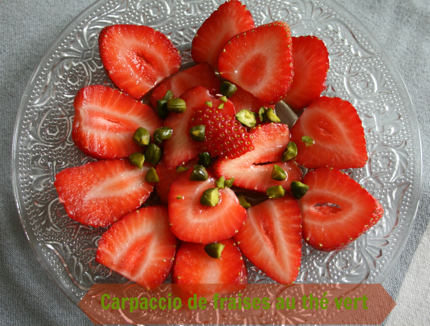 Ingrédients: pour 4 pers., 1 barquette de fraises, 75 gr de pistaches décortiquées et non salées, 100 gr de sucre, 1 c à c de thé vert.