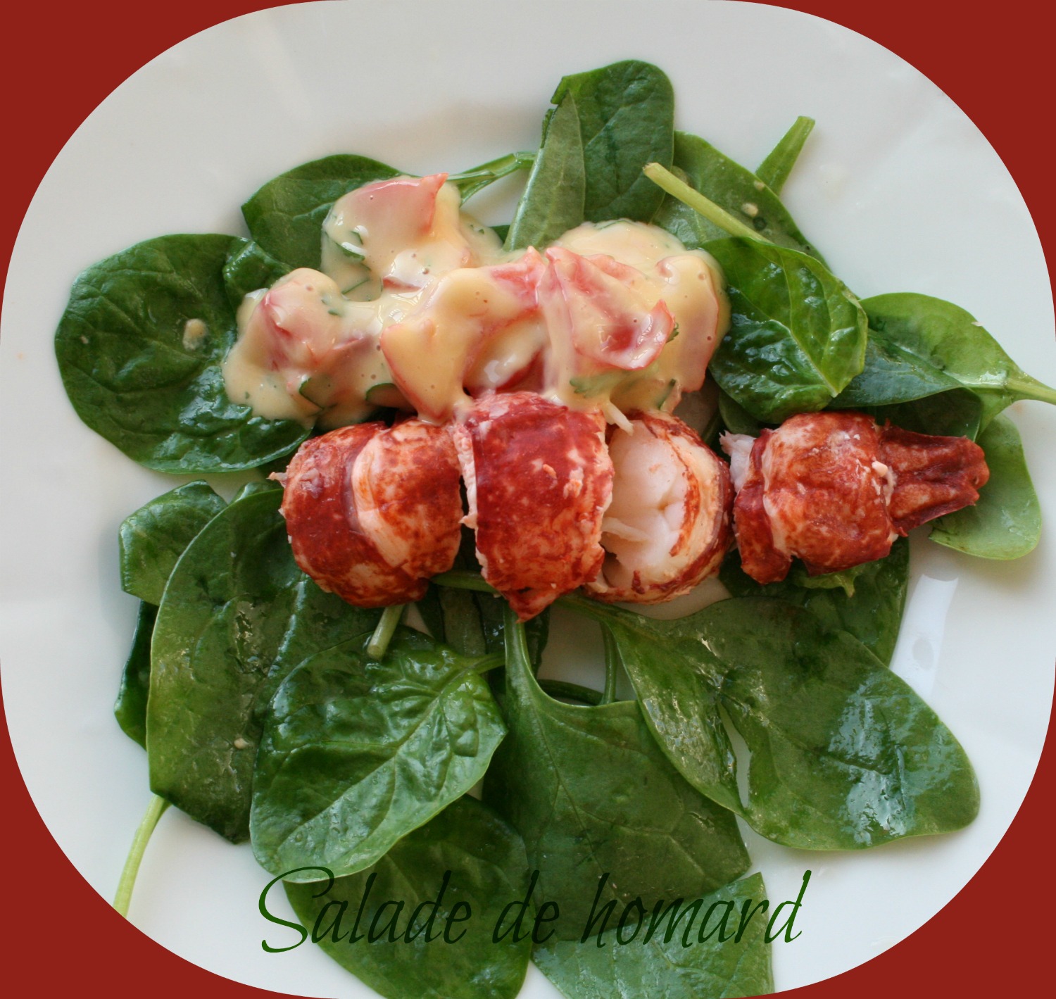 Ingrédients: 2 homards vivants (400 gr environ), le zeste d’un citron, gros sel, poivre en grain, 2 feuilles de laurier, une poignée de pousses d’épinard, 1 c à s d’huile d’olive, 1/2 c à s de vinaigre balsamique blanc. Mayonnaise: 1 jaune d’œuf, 1 c à c de moutarde, quelques brins de persil, fleur de sel, 1 échalote, 1 tomate, quelques gouttes de jus de citron.