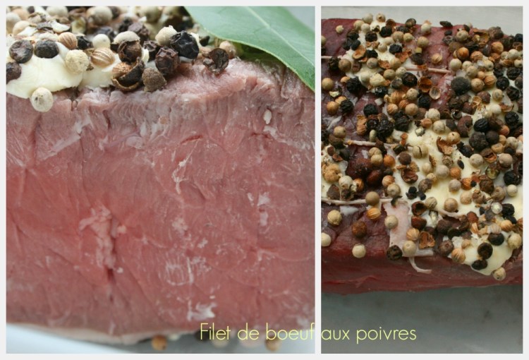 Ingrédients: 1 filet de boeuf de 800 gr, 2 cuillères à soupe de beurre mou, 2 cuillères à soupe de poivres mélangés, 1 c à café de gros sel, 1 feuille de laurier. Sauce: 15 cl de fond de veau instantané, 10 cl de crème fraîche, 1 c à café de poivres mélangés, 1 pointe de sel.
