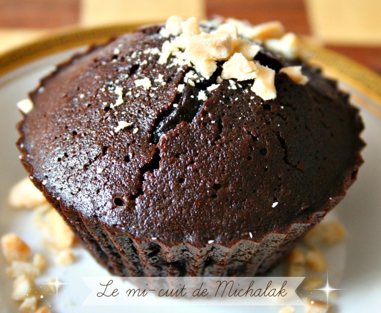 Ingrédients= 8 mi-cuit (dans des moules à muffins), 110 gr de chocolat noir (70% de cacao), 90 gr de beurre, 120 gr de sucre semoule, 3 oeufs , 40 gr de farine, 1 poignée d’amandes concassées (facultatif), 8 carrés de chocolat pralinés (facultatif).