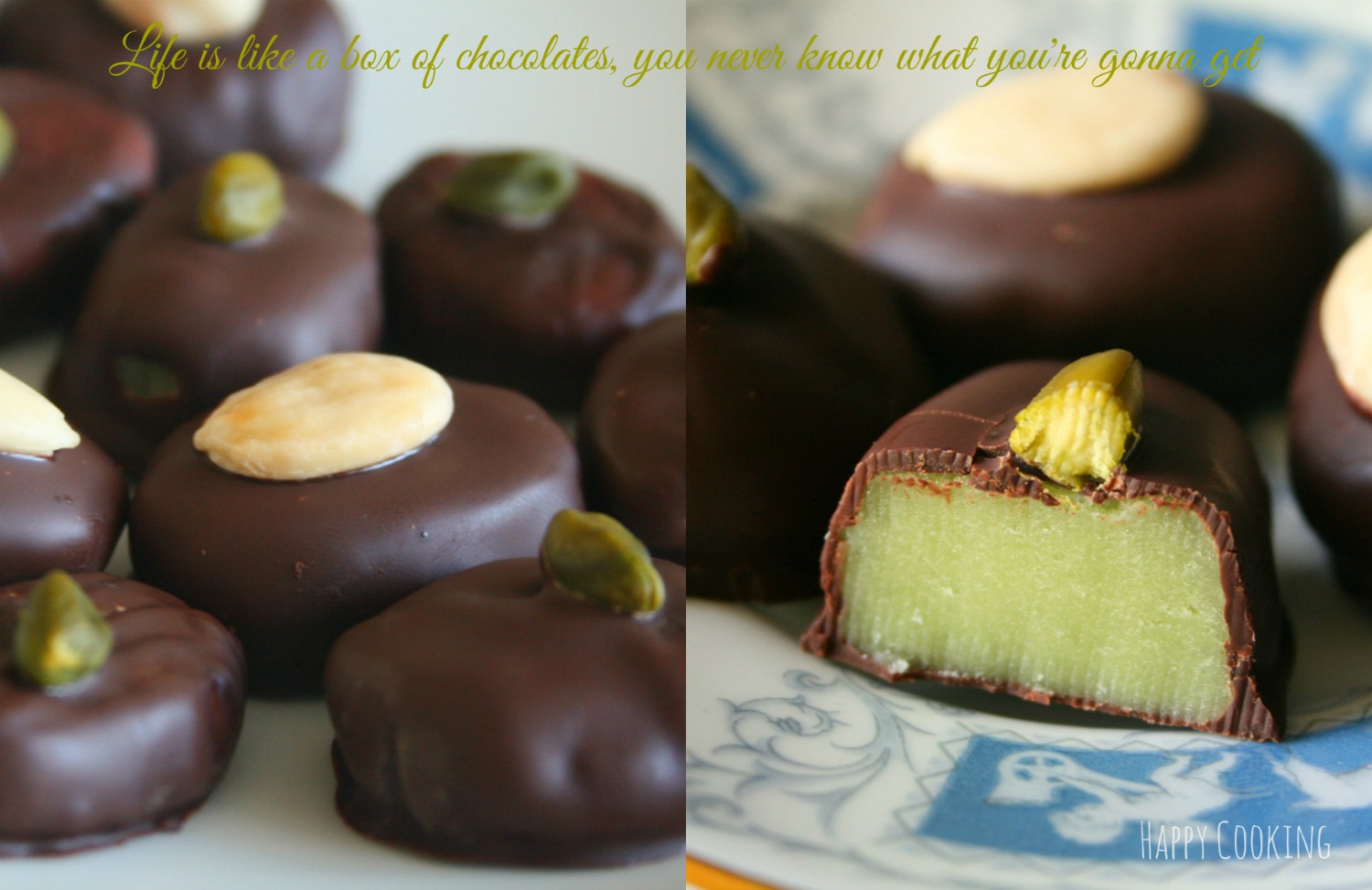Ingrédients: pour une dizaine de chocolats, 100 gr de pâte d’amande, 100 gr de chocolat noir corsé, une dizaine d’amandes, et ou de pistaches émondées.