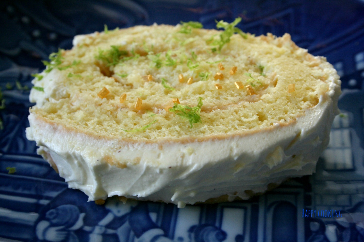 Avant de servir, couvrir la bûche de crème au mascarpone, faire des rayures avec une fourchette et décorer avec des zestes de citron vert et du sucre doré.