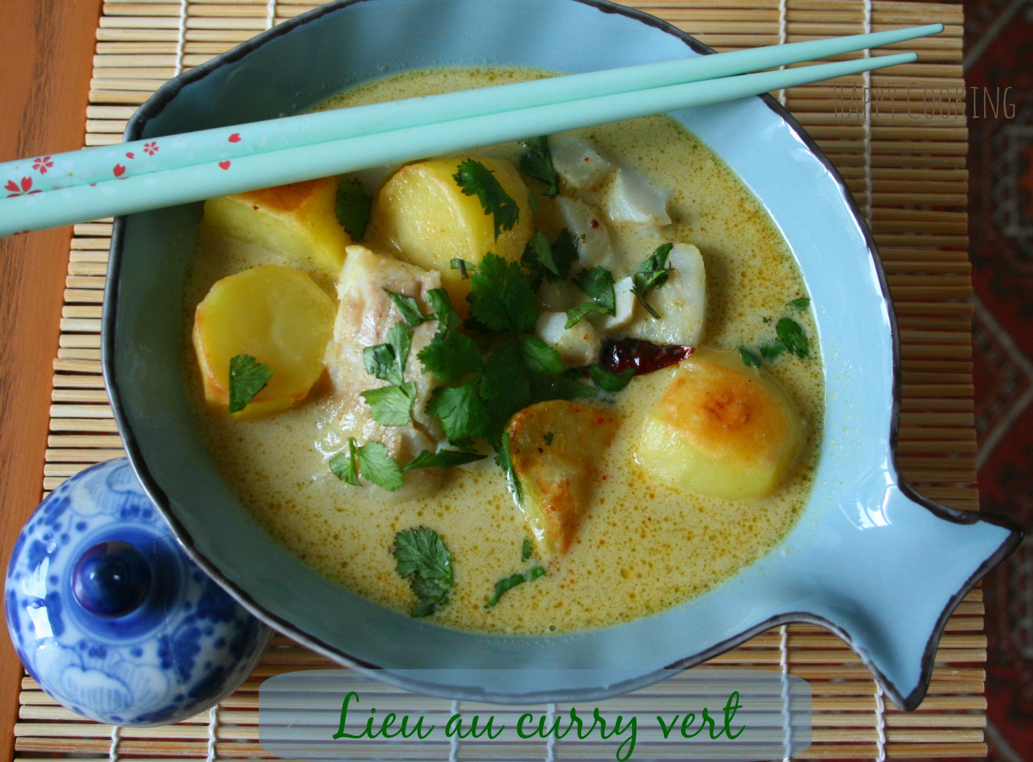 Ingrédients:  pour 4 pers., 4 pommes de terre, 3 cuillères à soupe d’huile neutre, 2 cuillères à soupe de pâte de curry thaïe verte, 50 cl de lait de coco, 6 feuilles de limes de cafres fraîches (facultatif), 1 c à s de sauce nuoc mam, 500 gr de filets de lieu (espadon dans la recette d’origine), 2 c à s de sauce de basilic fraîches (pas mis, ce n’est pas la saison), 2 c à s de coriandre fraîche hachée.