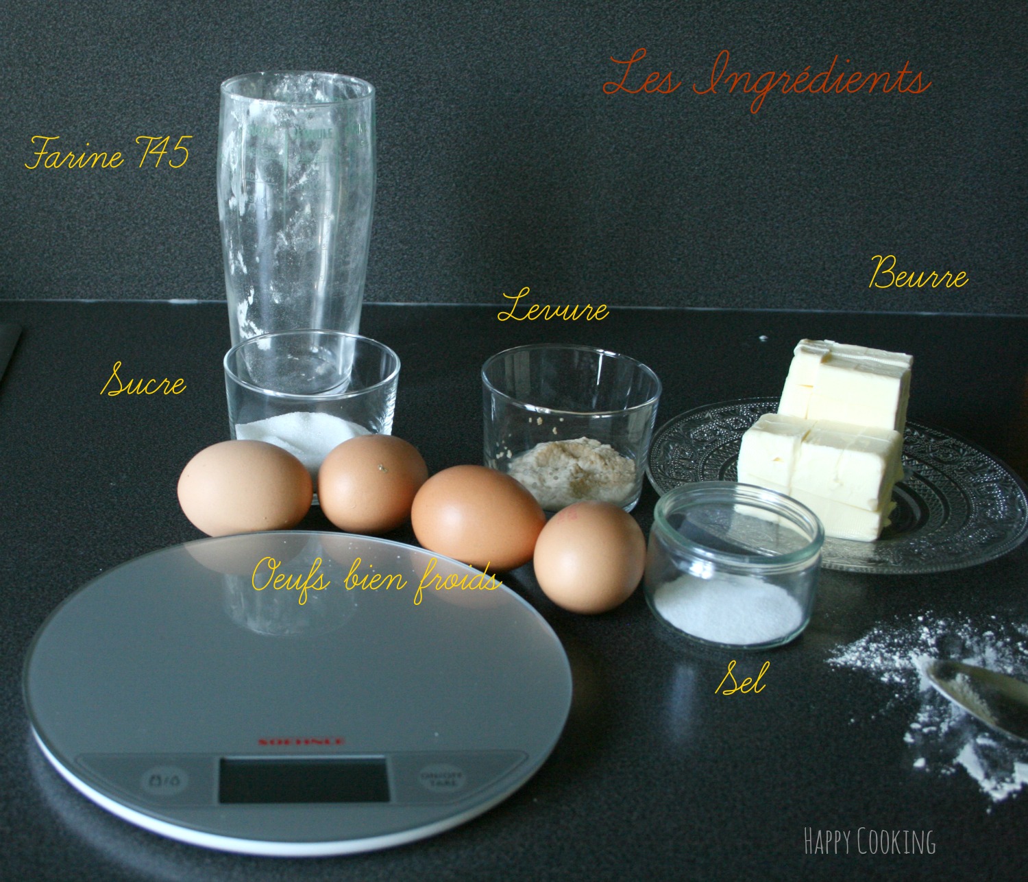 La pâte: préparer la pâte la veille. Mélanger la levure avec un peu d’eau tiède et laisser une quinzaine de minutes. Mettre 350 g de farine T 45 dans la cuve du robot , faire un puits et déposer 4 oeufs bien froids. Ajouter autour, en formant un triangle, 8 g de sel, 45 g de sucre en poudre et la levure diluée (les trois ingrédients doivent être bien séparés). Pétrir pendant 10 à 15 minutes. Incorporer 220 g de beurre coupé en morceaux (par petites quantités), pétrir pendant une dizaine de minutes (la pâte doit être lisse et se décoller des parois). Pour les plus rigoureux doté d’un thermomètre, la température de la pâte doit être entre 22 et 24°.