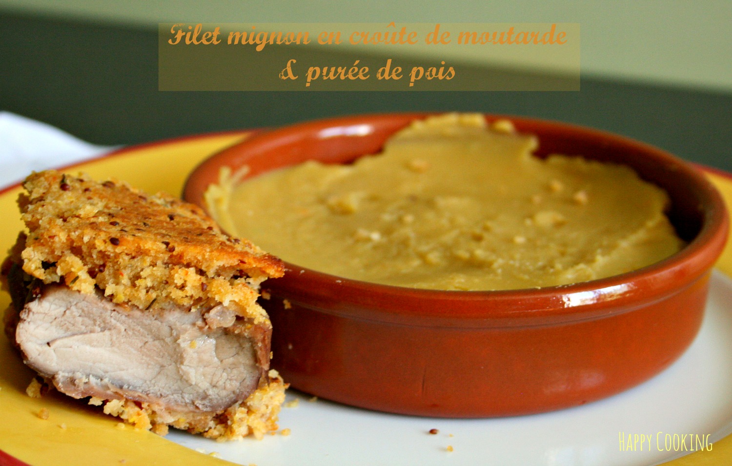 Filet mignon en croûte de moutarde et purée de pois cassés