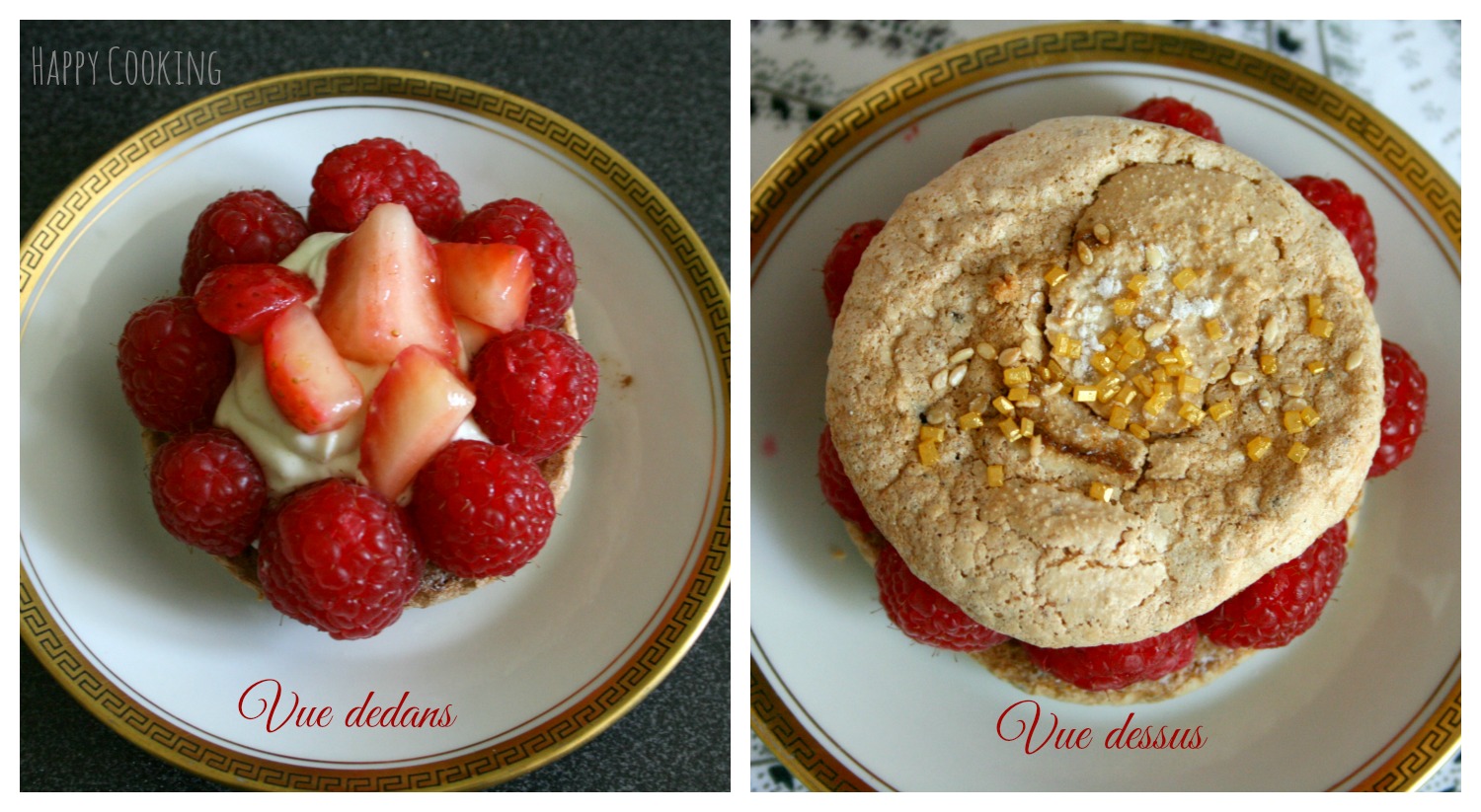 Dressage: sur une assiette, déposer un bun (garder les plus beaux pour le dessus). Au centre, avec la poche à douille, garnir de chantilly pistache (sans aller jusqu’aux bords). Déposer sur les bords les framboises, tout au tour. Recouvrir le centre de quelques morceaux de fraises (cf vue de dedans). Recouvrir avec un deuxième bun. Décorer avec du sucre doré.