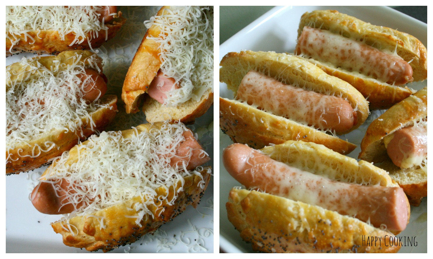 Garniture: dans une casserole d’eau bouillante, faire pocher les saucisses 4 minutes. Egouter. Réserver. Raper le gruyère, couper chaque Mauricette en 2 et badigeonner chaque côté de moutarde (y aller généreusement). Ajouter 1/2 saucisse dans chaque Mauricette. Mettre tous les hot dogs dans un plat allant au four. Saupoudrer de gruyère rapé, laisser chauffer dans le four en position grill le temps que le fromage fonde.