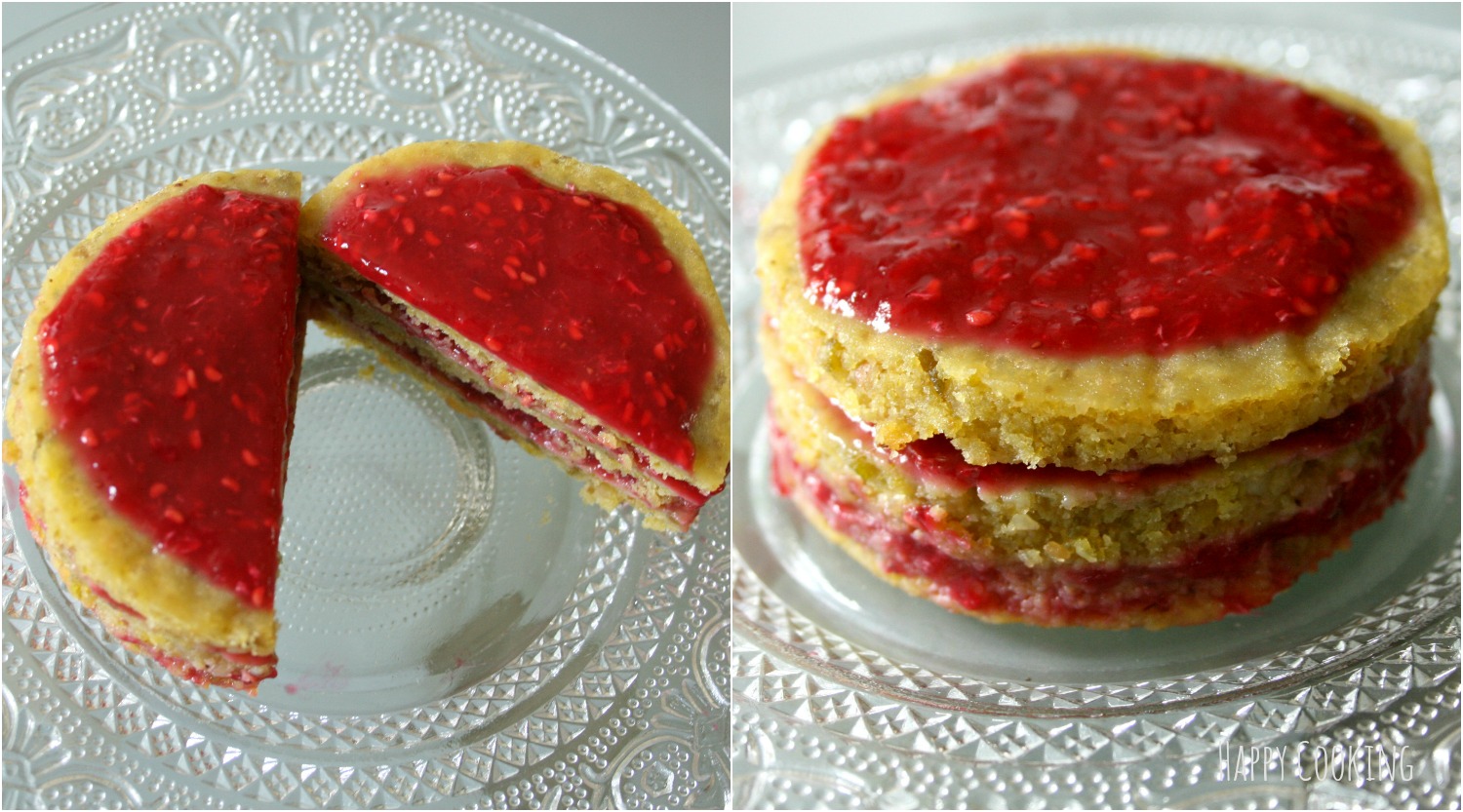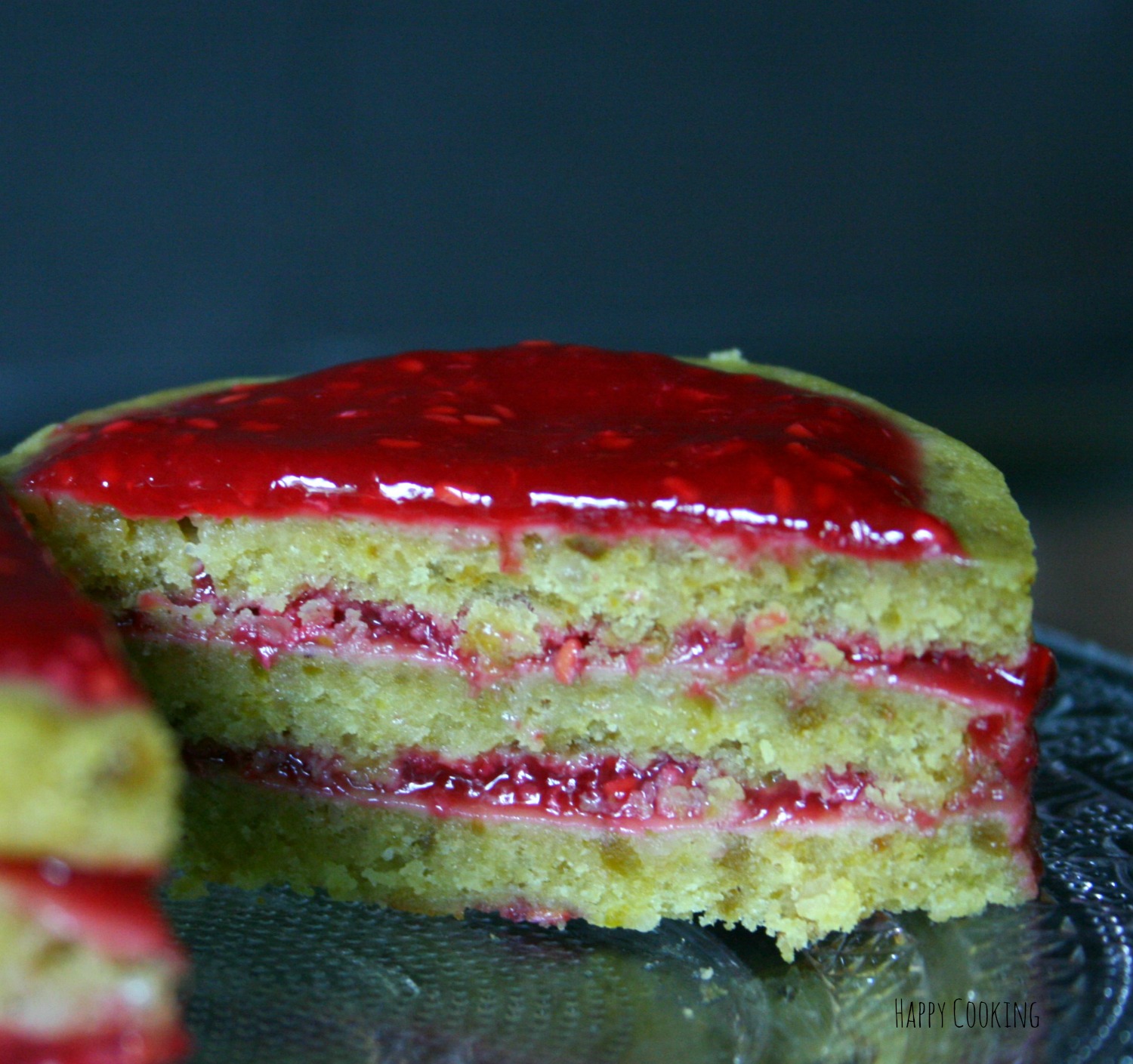 Montage: découper le biscuit refroidi en bandes ou en cercles d’égales longueurs. Sur la première bande, étaler une couche un peu épaisse de coulis de framboises, superposer une 2ème bande puis une couche de coulis. Rajouter sur le dessus du coulis de framboises, sans aller jusqu’aux bords. Dans la recette originale, la dernière bande de biscuit à la pistache n’est pas recouverte de coulis mais d’un glaçage au sucre et de brisures de pistaches. Voir ici. Laisser au frais 2h avant de servir.