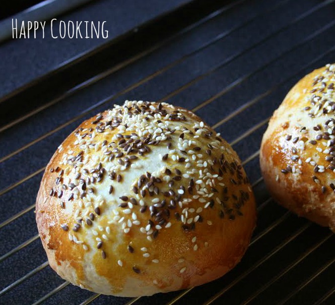 Cuisson: préchauffer le four th. 6-7 (200°C) . Dorer délicatement les buns avec de l’œuf entier (ou avec un jaune d’oeuf+ 1 pincée de sel pour une coloration plus prononcée) battu avec un peu d’eau et parsemer de graines de sésame ou pavot ou autre.