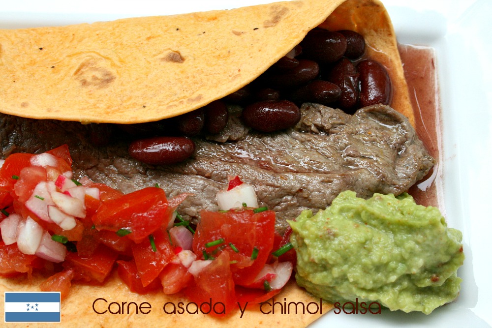 Pour France-Honduras, je pars à la découverte de la cuisine du Honduras. Même mon ami Google qui a toujours réponse à tout, n’est pas très bavard sur le sujet, à peine 3 lignes dans Wikipédia sur les curiles cuits dans les feuilles de bananiers. Sûrement très bon mais n’ayant pas de feuille de bananier sous la main, je me rabats sur cette recette de carne asada (viande grillée) et sa sauce chimol. C’est un plat typique d’Amérique Centrale, donc du Honduras (pour ceux qui en douteraient, j’ai rajouté une carte) que j’ai servi avec des tortillas, des haricots rouges et du guacamole. Bien dépaysant et idéal pour un barbecue !