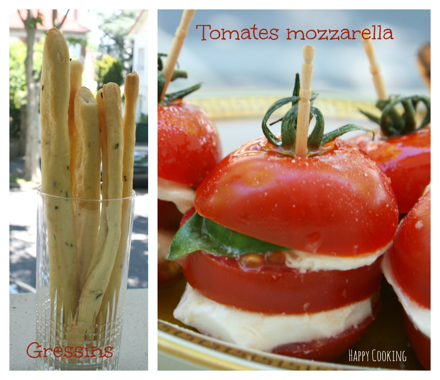 Tomates mozzarella: couper en 3 les tomates cerises, intercaler des rondelles de mozzarella et quelques feuilles de basilic. Piquer un cure dent, parsemer de fleur de sel et arroser légèrement d’huile d’olive.gressinsMini pizza