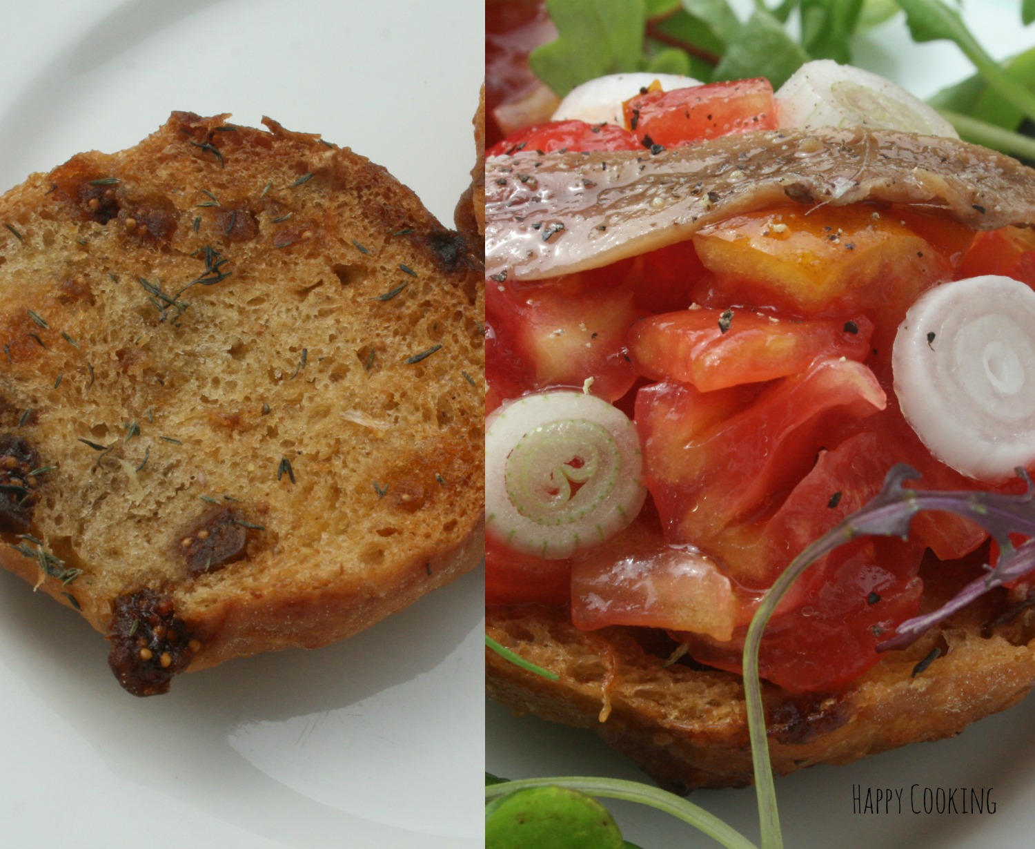 Ingrédients: pour 2 dakos, 1 petit pain rond un peu rassis (ou 2 pains biscottés), 1 belle tomate, 4 anchois, 1 petit oignon rouge frais, 2 gousses d’ail, thym, huile d’olive, sel, poivre, 20 gr de beurre.