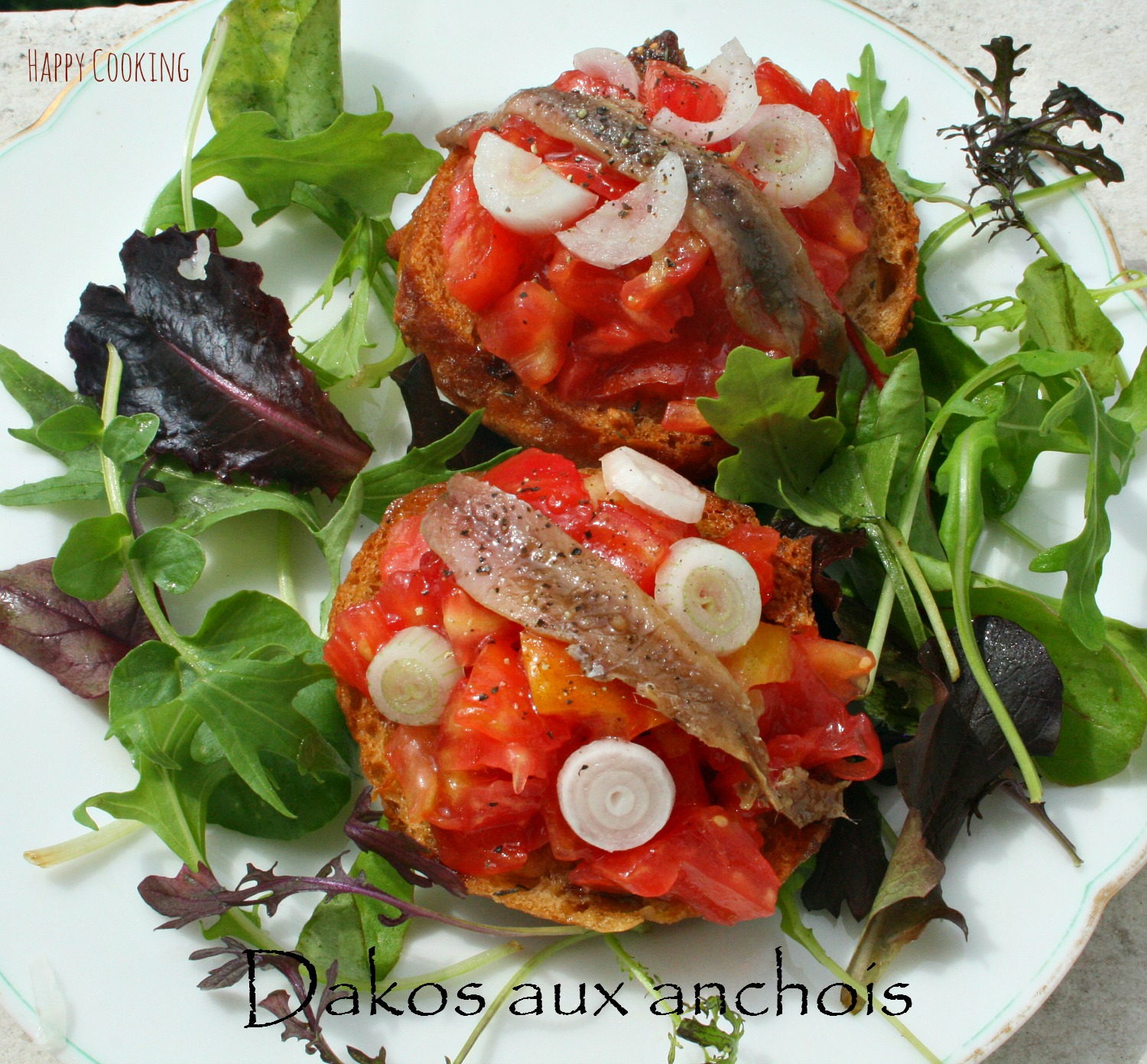 Dakos: éplucher la tomate, la couper en 4 et l’épépiner. La couper en petits dés, mettre dans un bol, mélanger avec une petite cuillère d’huile d’olive, saler avec de la fleur de sel. Déposer la tomate sur les pains refroidis, rajouter les anchois, l’oignon émincé. Laisser quelques minutes le pain s’imprégner de tomate, servir avec une salade.
