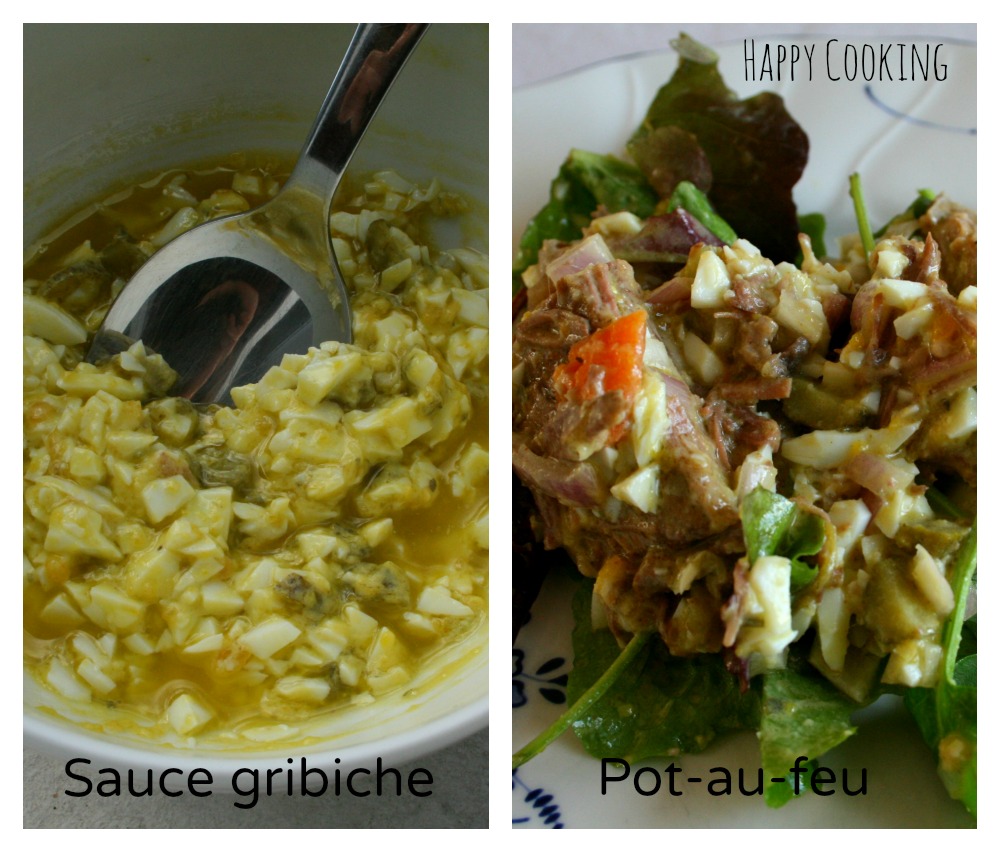 Ingrédients: pour 4 pers., les restes d’un pot-au-feu: viandes et légumes, 1 poignée de mesclun. Sauce gribiche: 1 oeuf, 1 càc de moutarde, huile d’olive, 1 càs de vinaigre balsamique, 4 cornichons, 1 échalote, sel poivre.