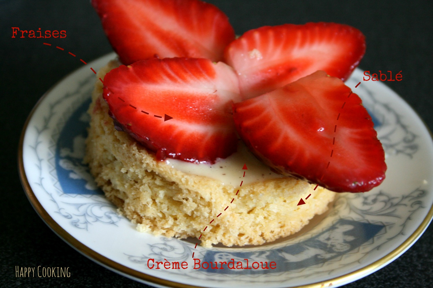 Le montage: découper les fraises en 2. Dans un saladier, mélanger les demies fraises, 1 cuillère à soupe de confiture, 1 c à s de jus de citron, 1 pincée de sel. Sur les sablés déposer un peu de crème Bourdaloue puis 4 ou 5 demies fraises.