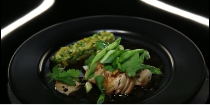 Dressage: dans chaque assiette, disposer les courgettes dans un emporte pièce. Ajouter un morceau de cabillaud sur les tronçons de cives (ou d’oignons nouveaux), verser du bouillon sur le poisson, rajouter la coriandre effeuillée.