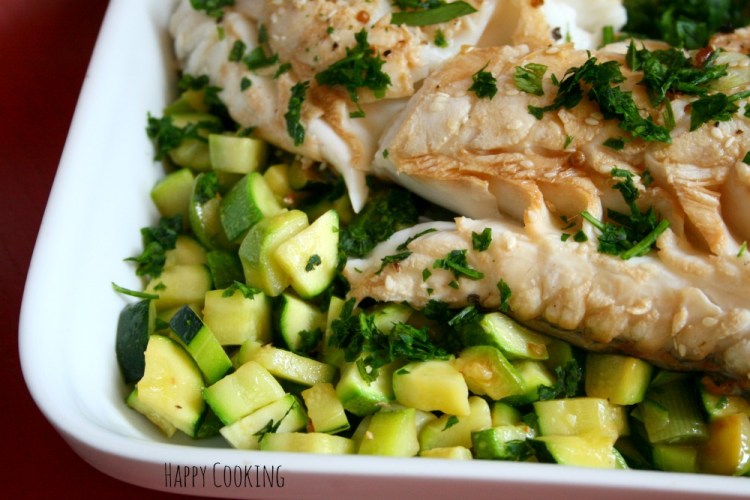 Cuisson des courgettes: quelques minutes avant la fin de la cuisson du poisson, faire chauffer l’huile d’olive dans une poêle. Quand l’huile est chaude, faire revenir quelques minutes les dés de courgettes. Saler et poivrer, les courgettes doivent rester croquantes.