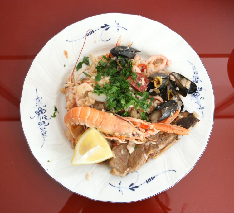 Ingrédients: pour 6 pers., 4 cuisses de poulet (ou de la côte de porc ou de l’échine), 1 quinzaine de rondelles de chorizo, 300 gr de calamars, 10 langoustines, 300 gr de moules, 200gr de petits pois, 2 grosses tomates (ou 500gr de tomates pelées), 1 poivron rouge ou vert, 2l d’eau, 1 oignon, 1 tête d’ail, 350gr de riz rond, 2 filaments de safran, 1 càc de piment doux, sel, poivre, 1 bouquet garni. Un plat à paella ou une grande sauteuse.