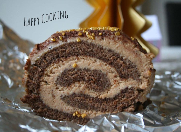 Montage: dérouler le biscuit, recouvrir le biscuit des 2/3 de la crème en laissant un peu d’espace sur les bords, là où se fera la soudure. Rouler délicatement la bûche en serrant bien. Réserver au frais 1h .