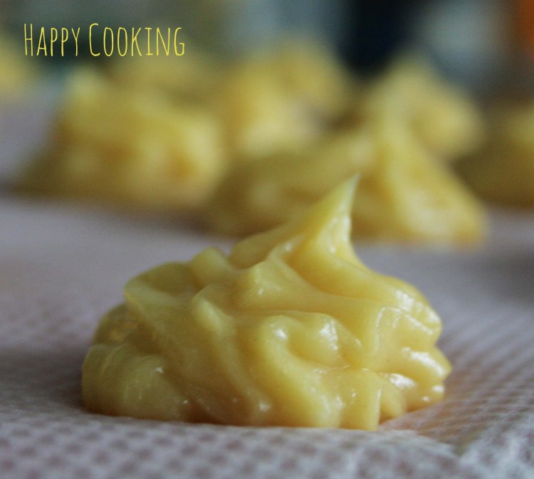 Coucher les pets de nonne:  Sur une plaque à pâtisserie recouverte de papier sulfurisé, déposer avec une poche à douille des petits tas de pâte, pas trop serrés. Rabattre la pointe de pâte sur le dessus avec une petite cuillère pour que les choux soient bien arrondis en gonflant.
