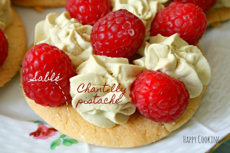 Ingrédients: pour 5/6 pers., Pâte à sablés bretons: 1 jaune d’œuf, 70 gr de sucre glace, 75 gr de beurre mou, 100 gr de farine type 45, 6 gr de levure chimique, 1 pincée de sel, 45 gr de poudre d’amandes. Chantilly Pistache: 200 g de crème fraîche liquide, 90 g de chocolat blanc, 15 g de pâte de pistache, 1 pincée de colorant vert (facultatif, moi je n’en mets pas, je ne suis pas fan de colorant). 1 barquette de framboises