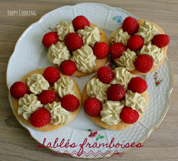 Montage: sur chaque sablé, déposer de la chantilly avec une poche à douille. Disposer joliment des framboises et servir.
