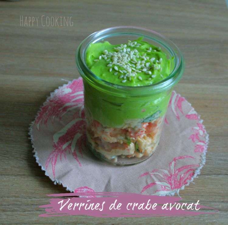 Montage: garnir le fond des verrines de crabe au lait de coco, ajouter par dessus la crème d’avocat, avec une poche à douille cannelée, c’est plus joli. Décorer avec quelques feuilles de coriandre ou des graines de sésame ou de pavot.