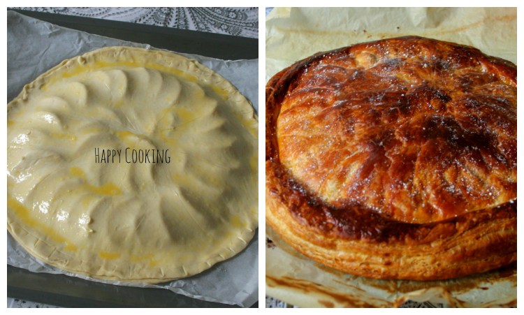 Recouvrir la galette avec un second rond de pâte. Bien souder les bords. Dessiner une rosace sur le dessus de la galette avec la pointe d’un couteau. Laisser un petit trou pour que la vapeur s’échappe à la cuisson. Entailler délicatement les bords pour que la pâte feuilletée monte mieux. Réserver au frais.