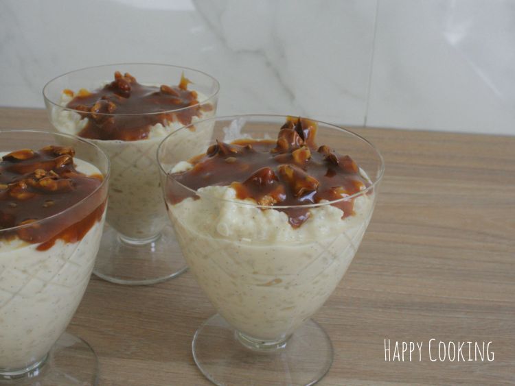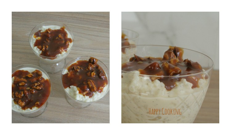Avant de servir: mettre le riz au lait dans des verrines, ajouter par dessus la sauce au caramel aux fruits secs.
