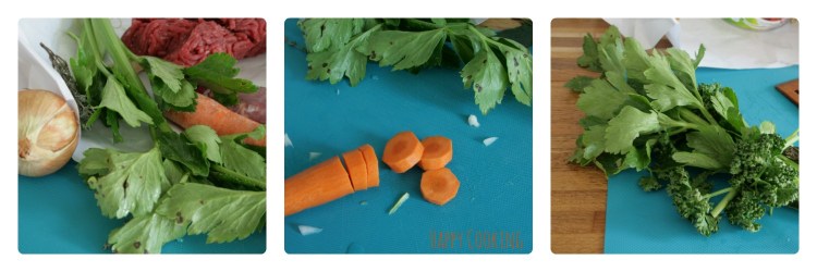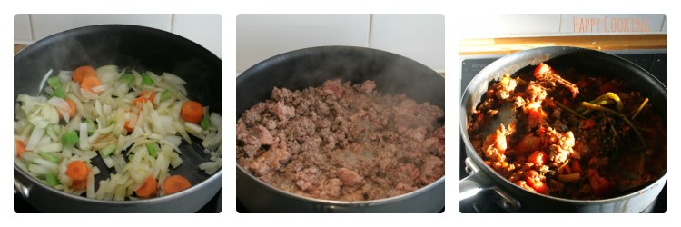 Remettre les oignons/ail sur la viande. Ajouter les tomates, les branches de céleris, les carottes coupées en très petits morceaux ainsi que les autres éléments cités dans les ingrédients.