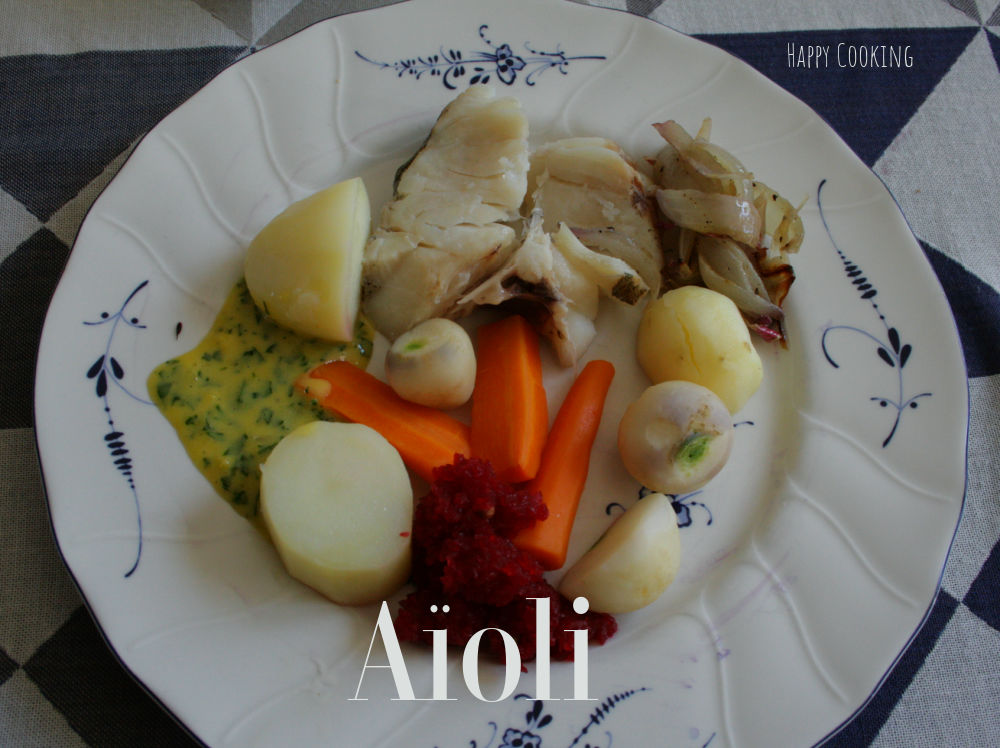 Sauce Aïoli: dans un mortier piler les gousses d’ail épluchées. Quand l’ail est réduit en purée, ajouter le jaune d’œuf, mélanger et monter la mayonnaise en ajoutant l’huile d’olive très doucement. Saler, poivrer, ajouter quelques gouttes de jus de citron et le persil haché.